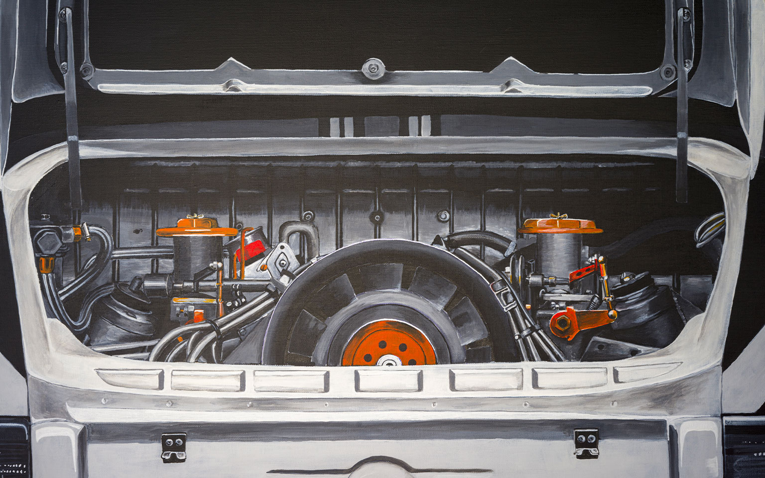 "NINEHUNDEREDELEVEN" -The power of the engine and its specific sound, the smell of petrol, the beauty of the curves of the body of the legend among cars and of course the original and unique tire print of this car, all that we can find on this canvas.